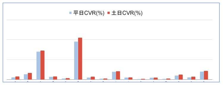 某広告媒体によるデータによると、土日は配信量が拡大してもCVRが高くなるということがわかります。